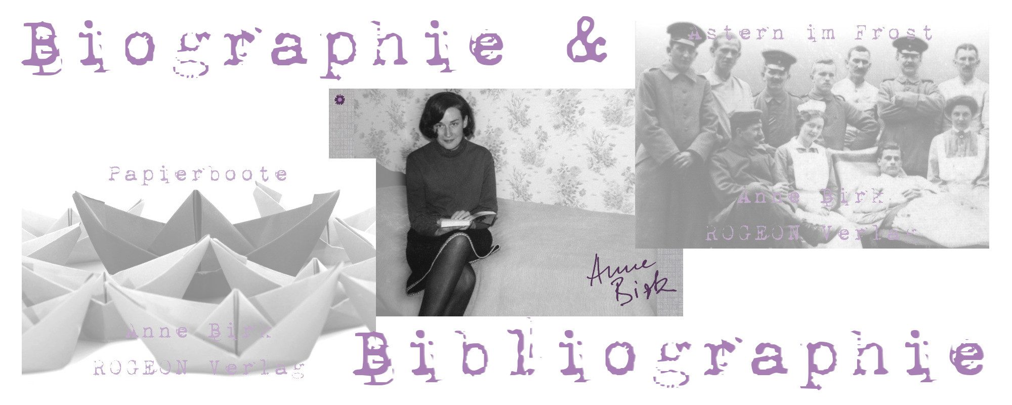 Über nachstehende Links gelangen Sie direkt zum jeweiligen Seiten-Abschnitt der Bio-Bibliographie von Anne Birk mit allen wesentlichen Informationen, Details und Links zu Vita und Werken der Schriftstellerin: